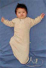 Unipussi on Suomessa nykyään melko tuntematon vaate. Keski-Euroopassa niitä löytää kaikista vauvantarvikeliikkeistä ja tavarataloistakin. Kätilöt suosittelevat unipussia vauvan ensimmäisen puolen vuoden ajaksi, sillä näin vauva tuntee omien jalkojensa ihon ja lämmön ja tämä luo turvallisuutta. Vauva voi liikuttaa jalkojaan vapaasti pussin sisällä. Riippumatossa nukkuvalle vauvalle unipussi on ihanan helppokäyttöinen. Myös kestovaippoja käyttävän valinta, sillä vaipanvaihto on yöllä pimeässä hyvin helppoa. |