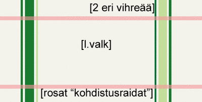valmiiksi, on syytä tehdä paksummalla langalla. Tarkoitus on siis kutoa hillitysti raidallinen (= vähemmän työtä) liina. Raidat laitetaan jo loimilankoihin ja itse kutominen sitten onnistuu yhdellä (l.valkoinen) värillä. Loimilankojen menekki oli laskennallisesti reilu 400 g luonnonvalkoista ja vihreitä kumpaakin alle 40 g. Lisäksi ajattelin tehdä kutomalla innovatiiviset kohdistusraidat eli liinan keskikohdan, johon kannettava on helppo sijoittaa. |
