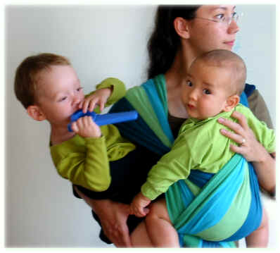 Minulla oli myös äitini esikuvana. Hän oli kantanut veljeäni neliörepun tapaisessa kantoliinassa, joten suosituksia ei tarvinnut kaukaa hakea. Ensimmäinen kynnys oli kuitenkin raha. En lannistunut siitä, vaan tein itse rengasliinan - joka suuntaan joustavasta farkkukankaasta! Rengasliinaan päädyin solmittavan pitkän liinan sijaan siksi, että ”alkeiskurssisivuillani” oli seuraava teksti: