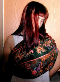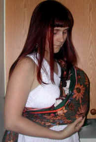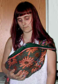 Riippumatto-sidonta on hyvin helppo. Liina laitetaan toiselle olkapäälle ja liinasolmu selkäpuolelle. Eteen muotoillaan pussi. Lapsi laitetaan tähän pussiin makaamaan kuin riippumattoon. Liina jää "ryppyyn" olkapäälle. Laskemalla sisäreunaa hieman sidonnassa voi imettää mukavasti. |