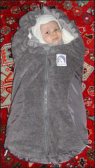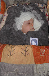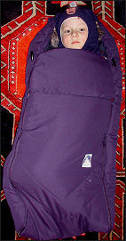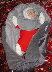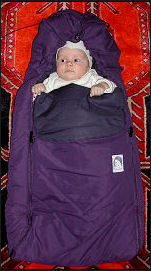 Vasemmalla: lämpöpussissa 2,5 kk ikäinen vauva. Hänelle pienempi pussi (kts. alla) on parempi valinta. |