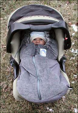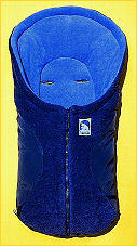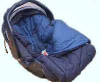 "Turvaistuinpussissa vauva pysyy napakasti kiinni istuimessa kevyissä vaatteissa ja pussi pitää vauvan lämpimänä." (Liikenneturva)".