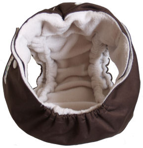 Käytettyään GrowHour-vaippaa omalla lapsellaan, hyvin laajan kokemuksen omaava kestovaippayrittäjä Keski-Euroopasta kommentoi:: "-The GrowHours are our favourite pockets, which never leak like other ones.". Seuraavana päivänä yksivuotiaan allergisen lapsen äiti, tottunut *vähän* löysempiinkin tuotoksiin, lähetti GrowHour-vaipasta palautetta: "-mieletön, mahtava, upea, loistava, istuva, toimii erinomaisesti!!". Oikealla kuva, jossa GrowHour-vaipan jalantietä raotetaan, kun se on 2,5-vuotiaalle puettuna. Kuvassa näkyy pehmeä vuotosuojakaukalo, joka toimii tuplavarmistuksena. |