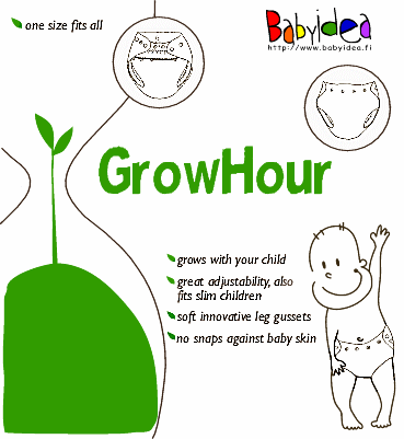 GrowHour on yhdenkoon vaippa, joka kasvaa lapsesi mukana. Vaipassa on innovatiivinen, pehmeä vuotosuojakaukalo, joka ylettyy kauas eteen ja taakse, huomattavasti pidemmälle kuin perinteiset vuotosuojat. Vaippa on lisäksi nopea ja helppokäyttöinen, ja lapselle miellyttävä käytössä, koska neppareita on vain yhdessä rivissä (jolloin liikkuvuus on erittäin hyvä).
