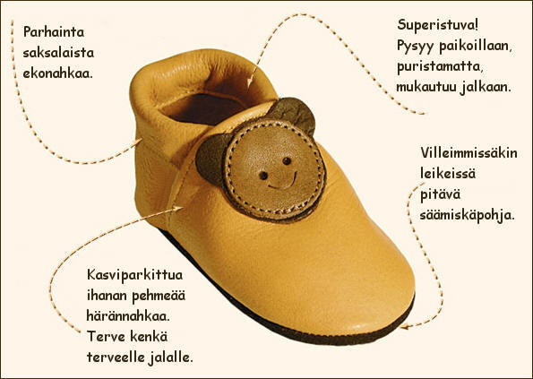 Ò Kahta täysin samanlaista tossua ei ole, sillä nahkaa ei ole peitetty peittovärikerroksen alle. Tämä myös takaa tossujen erinomaisen hengittävyyden sekä sen, että käytetty nahka on ensiluokkaista - voit nähdä sen itse.